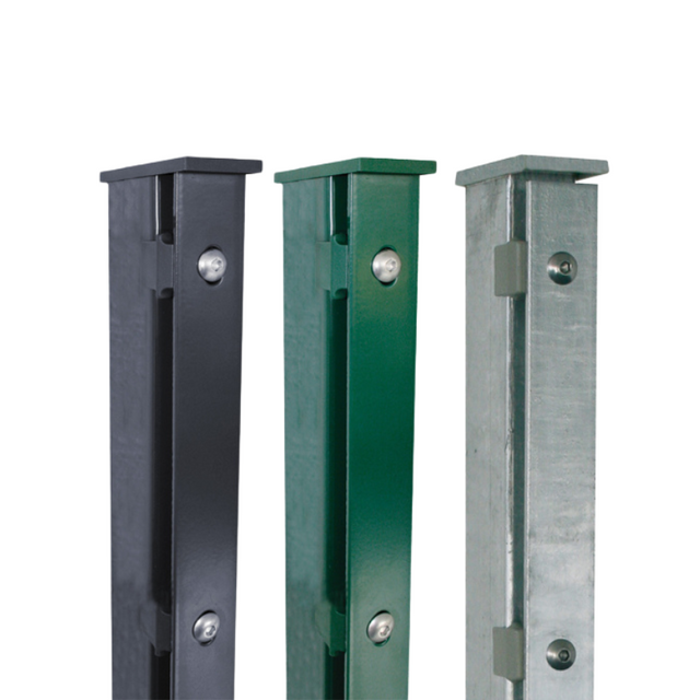- Pfosten zum Aufdübeln haben eine angeschweißte Bodenplatte (100x100 mm für Höhen bis einschließlich 1630 mm, ab einer Zaunhöhe von 183cm werden Pfosten zum Einbetonieren inkl. einer Bodenkonsole zum Aufdübeln geliefert)