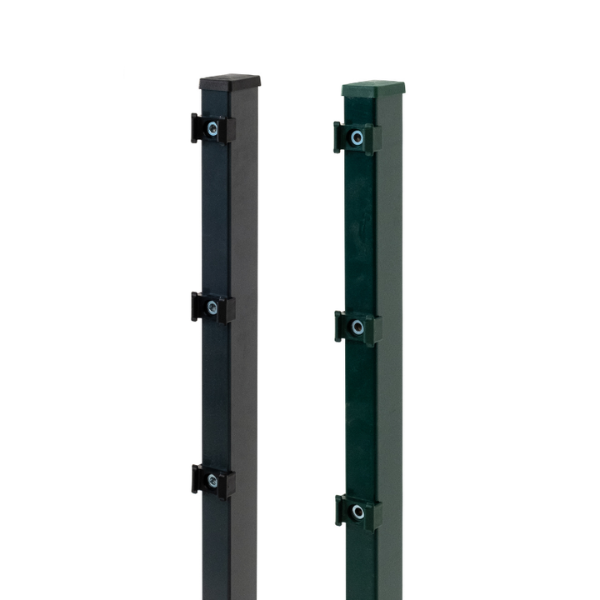 - Pfosten zum Aufdübeln haben eine angeschweißte Bodenplatte (100x100 mm für Höhen bis einschließlich 1630 mm, ab einer Zaunhöhe von 183cm werden Pfosten zum Einbetonieren inkl. einer Bodenkonsole zum Aufdübeln geliefert)