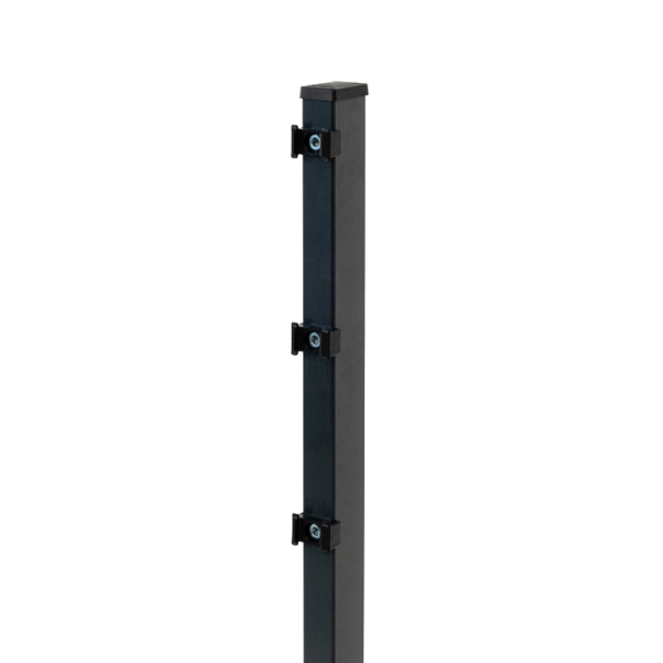 Du erhältst den Pfosten inklusive Zubehör zum Montieren der Doppelstabmatten und kannst je nach Bodenbefestigungsart den passenden Bolzenanker mitbestellen.